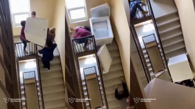 Четири жени се обидуваат да пренесат фрижидер по скали.
