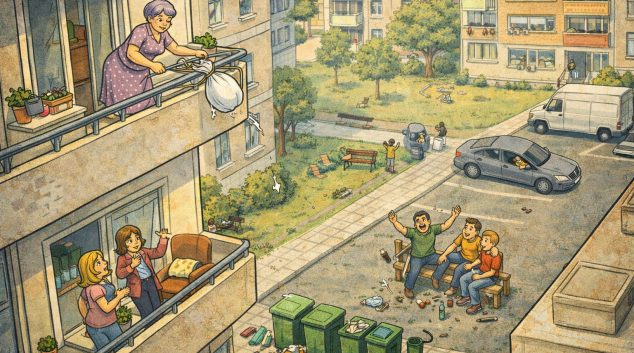 „Е*ати скапаната држава…“ си мислеше тетка Марина, додека од терасата на петти кат си го фрлаше ѓубрето, па не успеа ни да го погоди контејнерот. Во исто време, паркирајќи ја колата, чичко Митко го спушти прозорецот и го фрли отпушокот на тротоарот, мрморејќи нервозно: „Море да ви е*ам и ѓубрињата, цел ден ви ‘рмбам за …