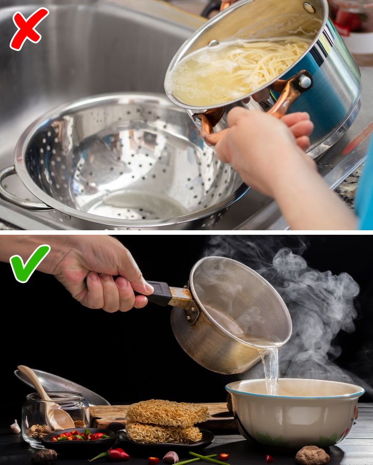 Обично ја фрламе водата во која се варени тестенините. Ова е голема грешка, бидејќи оваа вода се користи за да се направи сосот поконзистентен и повкусен. Затоа се препорачува оваа течност да се префрли во сад и да се измеша со сосот кој ќе стане погуст.