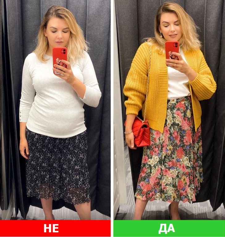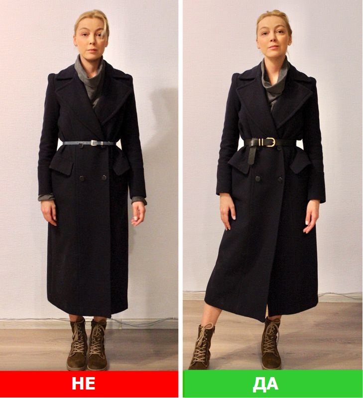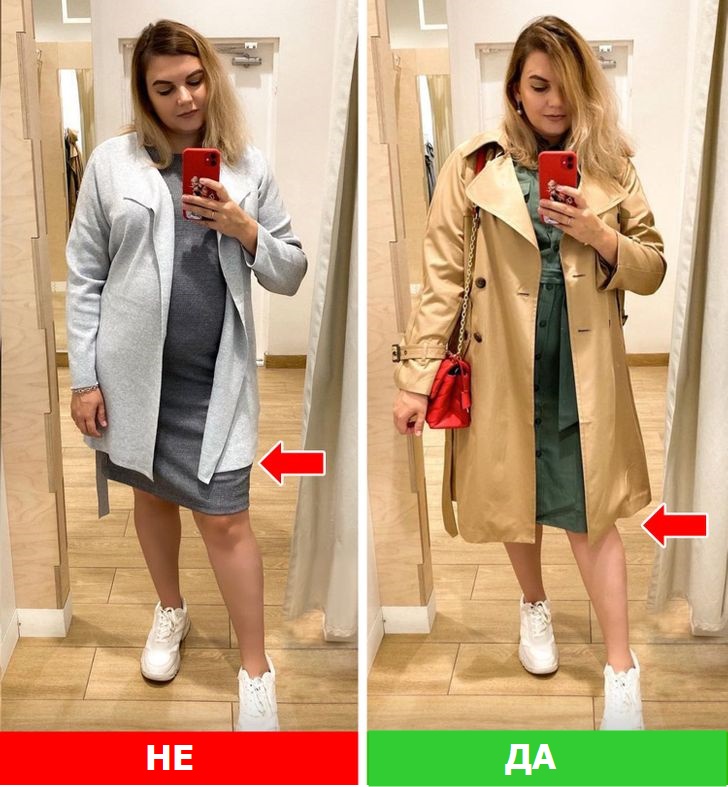 Не носете мантил или палто што е пократко од здолништето, особено ако е во контрастна боја. Кога го правиме ова, се појавуваат дополнителни линии, кои визуелно ја пресекуваат фигурата и ве прават да изгледате со вишок килограми.