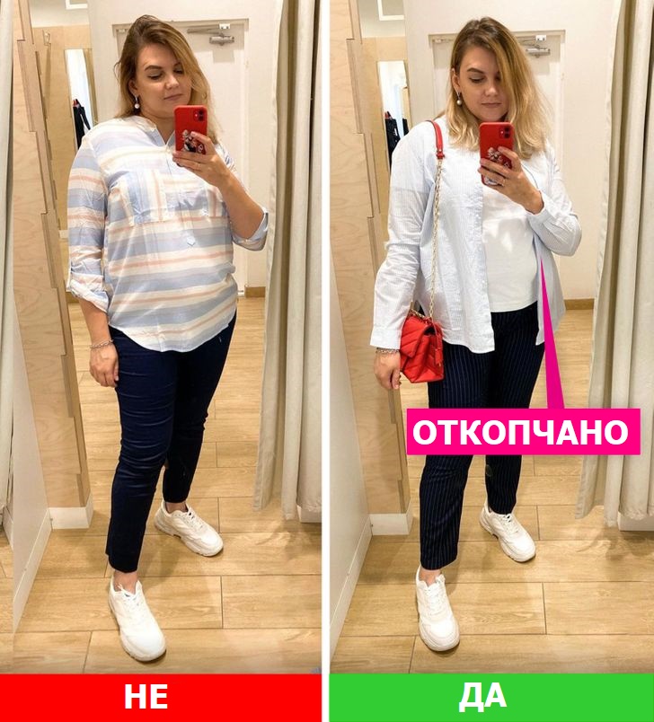 Исто така, избегнувајте мали и детски модели на облеката што можат да привлечат премногу внимание кон стомакот.