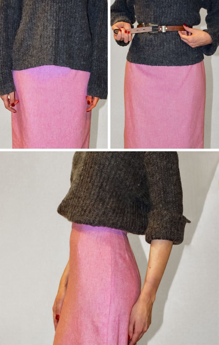 Опуштениот џемпер или плетена блуза може да ја сокрие вашата половина и да го направи долниот дел од телото пократок. Користете ремен, како што е прикажано на сликата, за да го подигнете џемперот и да ја издолжите фигурата.
