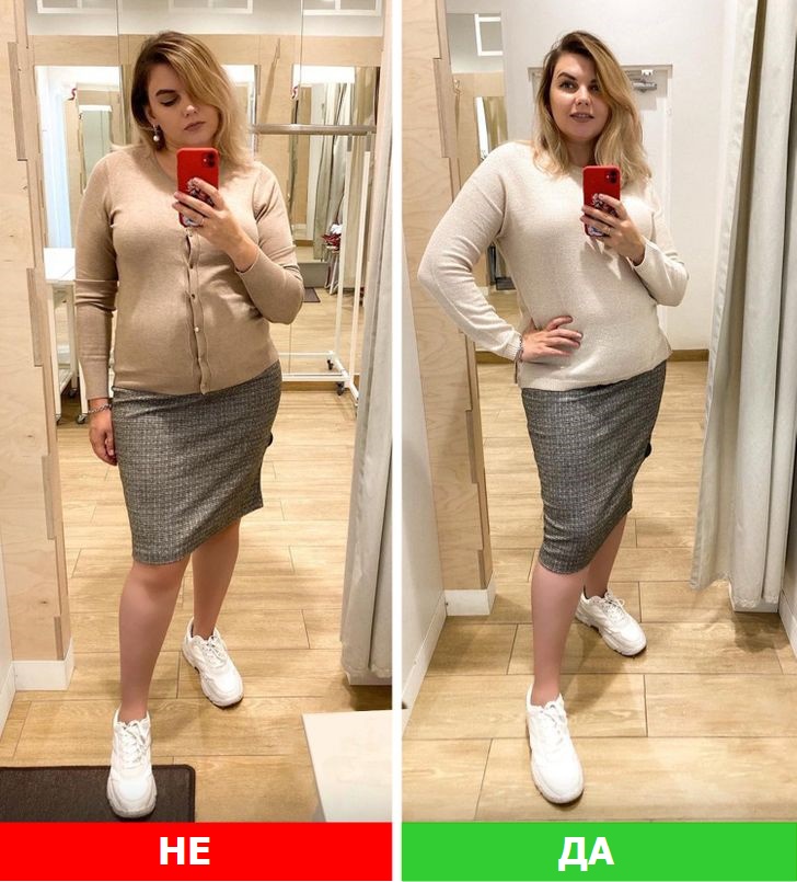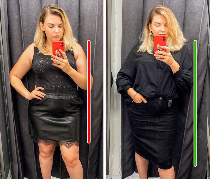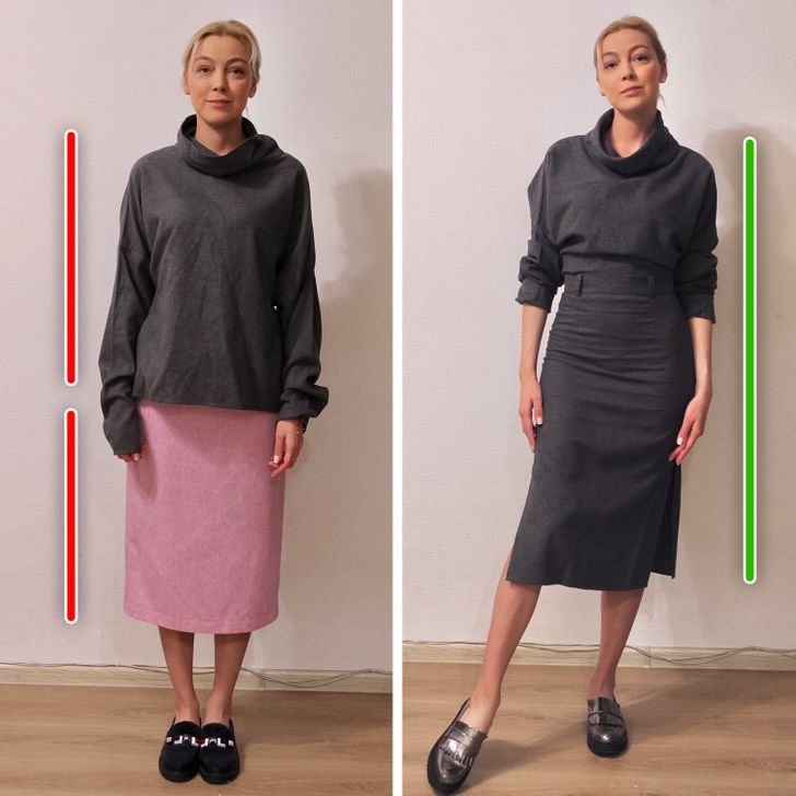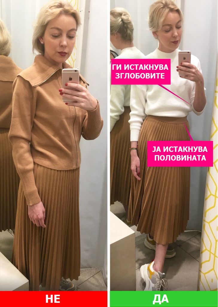 Не ја спуштајте блузата надолу премногу, бидејќи тоа може да ја подели фигурата на 2 непропорционални дела. Ова е особено точно кога боите на дното и горниот дел се контрастни. Вметнете ја блузата во здолништето и одозгора облечете откопчан џемпер или јакна.