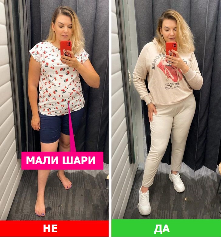 Кратките панталони нема да ве направат витки, онолку колку што би сакале. Многу често тие само ги откриваат недостатоците. Ако изберете тренерка, тогаш подобро е да им дадете предност на поопуштените кроеви. Ако сепак инсистирате на шорцеви, тогаш изберете со соодветна должина и внимавајте да не бидат претесни.