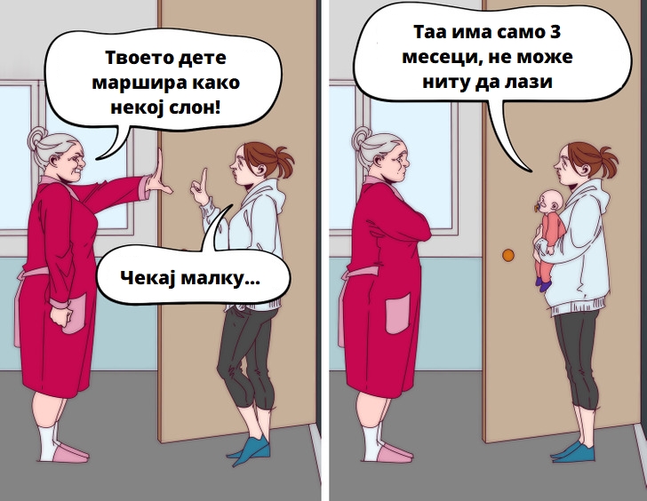 По раѓањето на детето, младите родители за првпат се среќаваат со своите соседи. Тие мислат дека децата се премногу бучни.