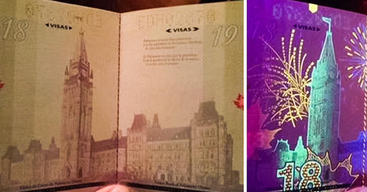 Една фасцинантна работа за канадскиот пасош е тоа што секоја страница во него свети под ултравиолетова светлина и го прави да изгледа апсолутно прекрасно. Под ултравиолетова светлина, таму можете да видите и скриени работи, како огнометот на сликата погоре!