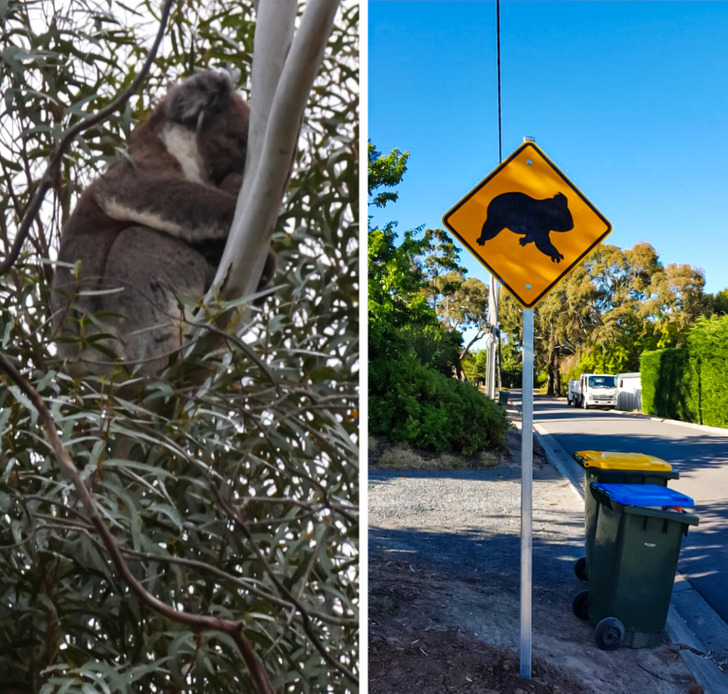 „Еве ја коалата што живее во мојот двор и новиот знак што советот штотуку го постави за да може безбедно да го помине патот“. Австралија секако.
