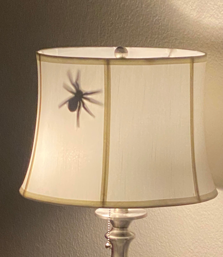„Испечатив форма на пајак и внимателно ја исеков со ножички и ја залепив со селотејп на внатрешната страна на нејзиниот абажур. За среќа, имам удобен тросед“.