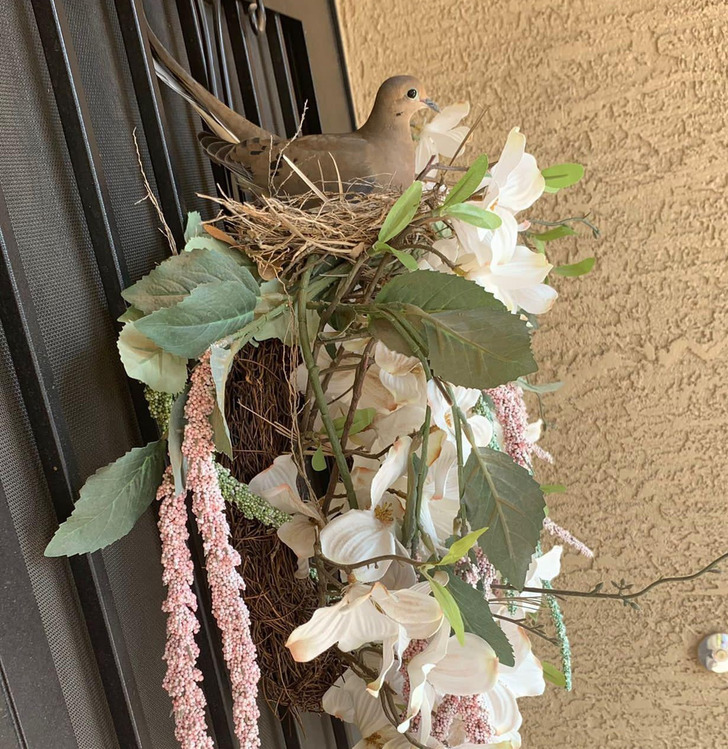 „Гулаб направи гнездо на венецот што висеше на мојата влезна врата“.