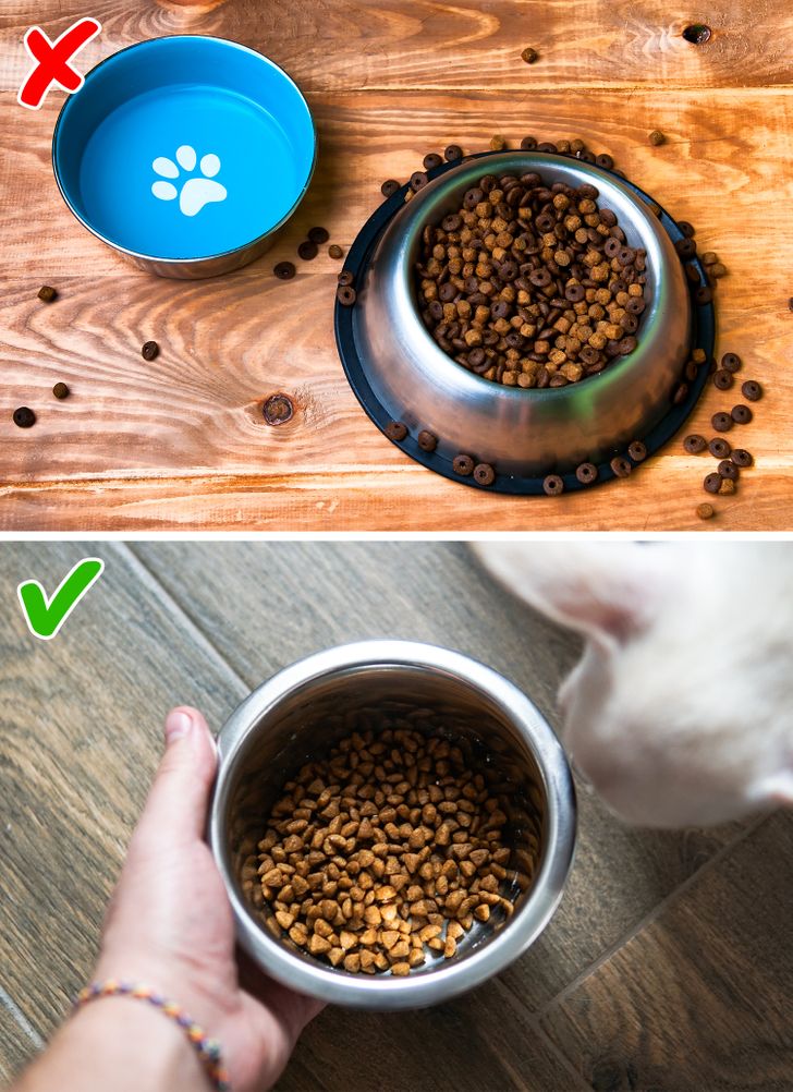 Домашните миленици често не јадат многу внимателно, расфрлајќи ја храната околу садот. Покрај тоа, понекогаш имаат необичен пристап кон храната: претпочитаат да не јадат сè одеднаш, туку да се влечат низ куќата во текот на денот. Во двата случаи, куќата станува вистинска почва за бактерии. Најдобар начин да го избегнете ова, покрај периодичното миење на чиниите и бришењето на површините, е да ги отстраните садовите од подот по даденото време за хранење.