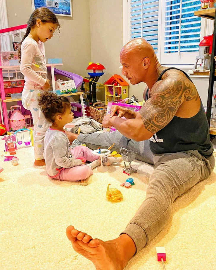 Победникот на анкетата, Двејн Џонсон, има 3 ќерки : Симон, Јасмин и Тиа. Сега гледаме зошто родителите се желни да ги остават своите деца со Двејн. Погледнете само колку е вклучен и грижлив на фотографијата подолу, играјќи си со своите ќерки!