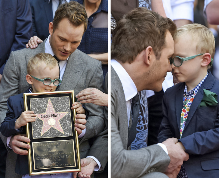 Крис Прат има 3 деца. Сликите подолу го прикажуваат Крис и неговиот син Џек на церемонијата на доделување на ѕвезда на Булеварот на славните во Холивуд.