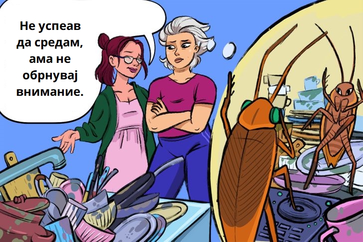 Таквата планина јадења може да им се допадне само на лебарките. За да не се забавувате во дискотеката со лебарки, најдобро е да ги измиете сите садови навечер.