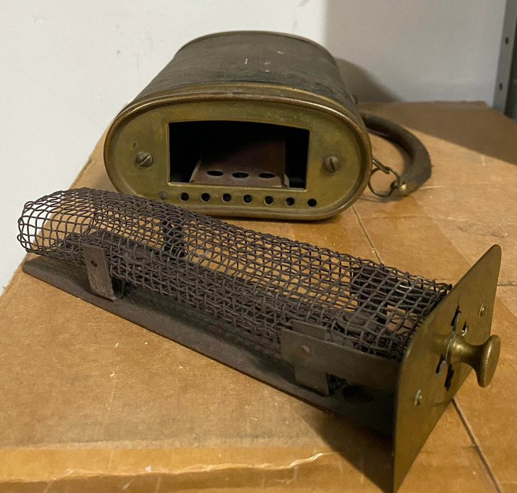 4. „Чудна чанта, изработена од метал и кадифе со кафез внатре во неа, прилагодлив отвор на едната страна и отвори за воздух на страната што се извлекува“