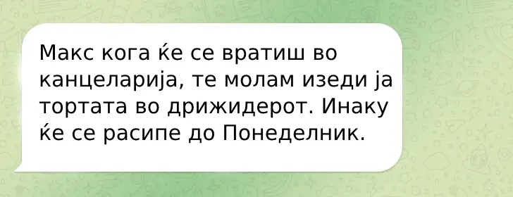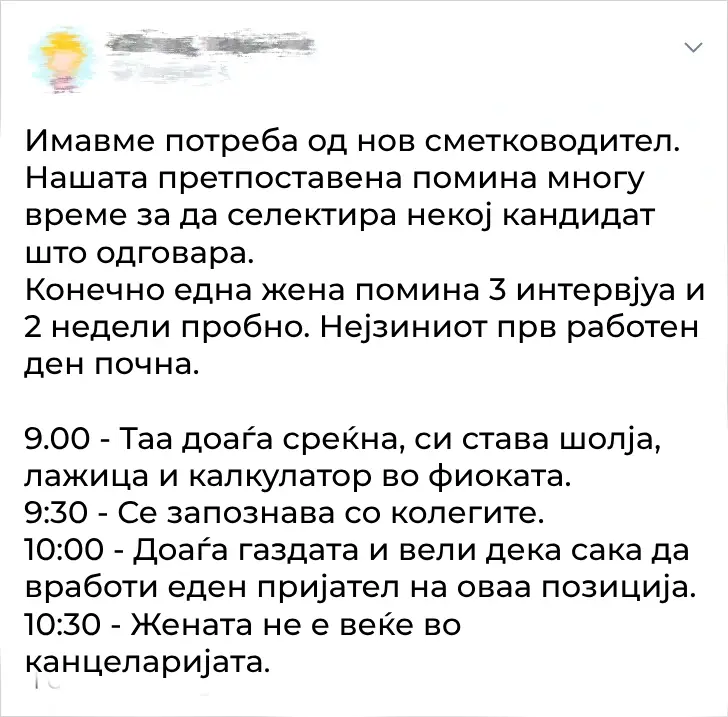 Добив нова работа. Добив многу задачи од претходната вработена, а мојата шефица, Натали, ме замоли да одам директно кај неа со секое прашање. Еден ден, налетав во нејзината канцеларија и реков: „Ирина, имаме итен случај, доаѓа ревизорот!“ И тогаш сфатив дека по грешка сум ја нарекол по името на мојот претходен менаџер.