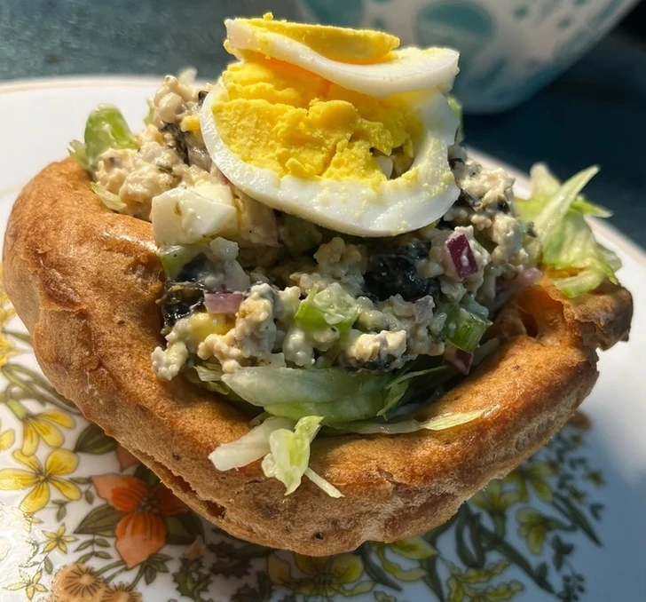 Изрендајте ги жолчките од јајцата и чувајте ги за декорација. Исечкајте ги белките и измешајте ги со туната, целерот и маслинките. Додајте мајонез и сервирајте ја салатата во чинија обложена со зелена салата.