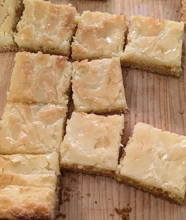 Растопете го путерот и измешајте го со мешавината за колач и едно јајце за да добиете тесто. Распределете го тестото во плех 23×33 см. Изматете ги останатите состојки и нанесете ги врз тестото. Печете на 175°C околу 30–40 минути. Оставете да се излади и уживајте во кремастите слоеви!