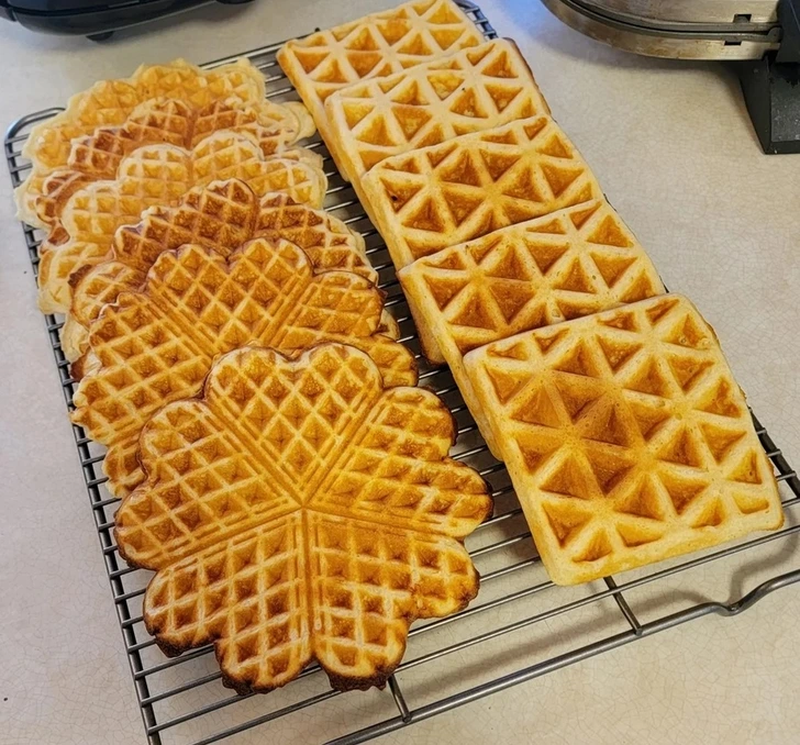 Измешајте ги сувите состојки, а потоа додајте ги матеницата, путерот и јајцата. Печете во вафлиер додека не добијат златно-кафеава боја. Послужете со путер и сируп.