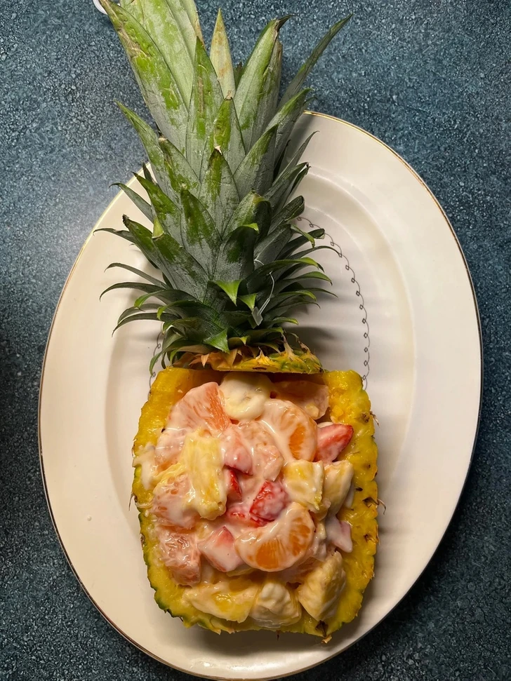 Пресечете го ананасот надолжно на половина, оставајќи ги зелените лисја за декоративен ефект. Извадете ја внатрешноста, исечете ја на коцки и ставете ја во сад. Измешајте сок од портокал, сол, шеќер, Табаско и лимон, а потоа додајте мајонез и павлака. Наполнете ги ананасовите половини со овошјето и прелијте го сосот одозгора.