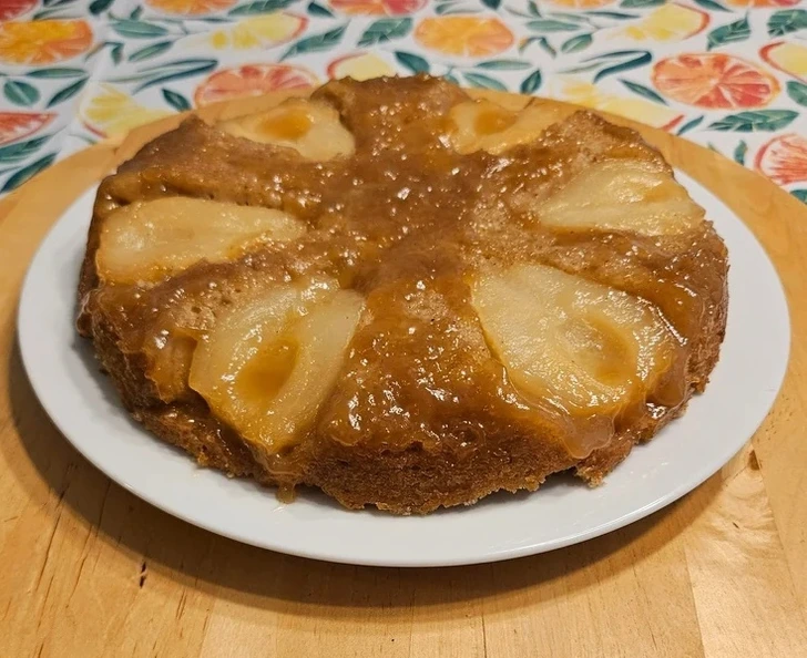 Загрејте ја рерната на 175°C. Направете го топингот со мешање на путерот, шеќерот, брашното и сокот од круша. Истурете го во сад за печење и подредете ги крушите. Направете го тестото, прелијте го врз крушите и печете 45 минути. Превртете го колачот на тањир пред сервирање.