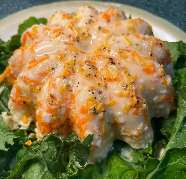 Растворете го желатинот во врела вода, додајте оцет и мајонез и мешајте додека смесата не стане мазна. Оставете да се стегне малку, а потоа додадете ја зелката, морковот и кашкавалот. Префрлете ја смесата во калапи и оставете ја во фрижидер додека целосно не се стегне.