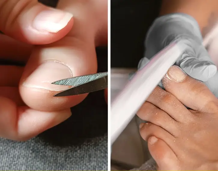 Некои експерти советуваат да се исечат ноктите на нозете со помош на ножици за маникир или нокти. Сепак, не секој може правилно да ги прицврсти плочите за нокти со овие алатки, а некои дами имаат тенденција премногу да ги скратуваат ноктите, што може да доведе до враснати нокти.