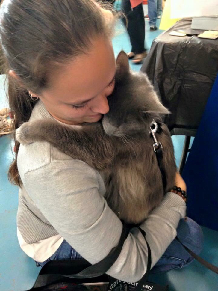 5. „Мојата слепа мачка оди на ремен и се качува на луѓето за да ги прегрне“.