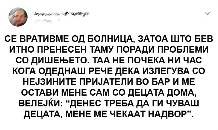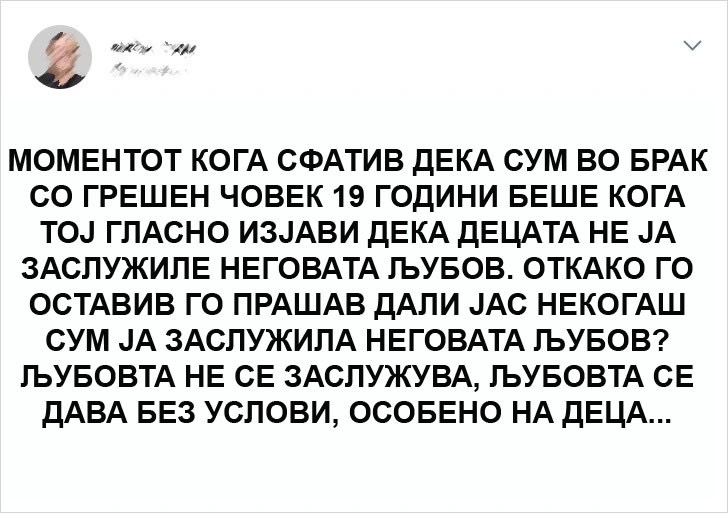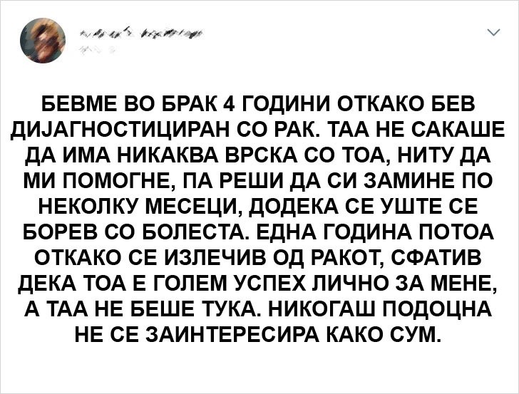 - „Беа тоа неколку работи. Во една прилика, дури и не се сеќавам на причината, но се обидов да посредувам со неа и со ќерка ми. Реков: „Ќерко, направи нешто погрешно, ајде да и се извиниме на мама“. И таа се извини. Потоа ја замолив жена ми да ѝ се извини на ќерката, а таа категорично одби да се извини. Ја познавам оваа дама повеќе од 20 години и никогаш не сум ја слушнал како се извинува. Буквално никогаш. Последната капка беше кога едно од нашите деца сакаше прегратка за добра ноќ пред спиење, но мојата сопруга се заклучи во нашата соба и ја одби прегратката затоа што веќе ги прегрнала порано во текот на денот. Децата плачеа, а јас бев скршен гледајќи го ова додека ме прашуваа: „Зошто мама не сака да ме прегрне?“