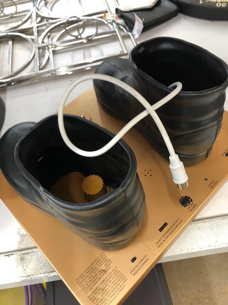 10. Лажни пластични чизми прикачени на табла, со копче што може да се притисне, аудио контроли и прекинувач за англиски/шпански.