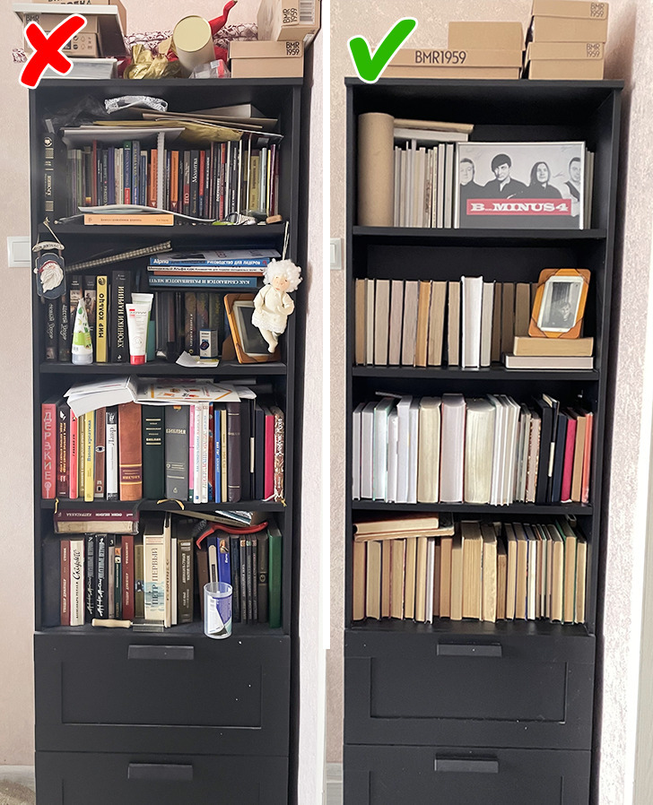 Постои некоја нова мода книгите треба да се редат со страниците свртени кон предниот дел. Подоцна ќе може да се подредат книгите потрадиционално: