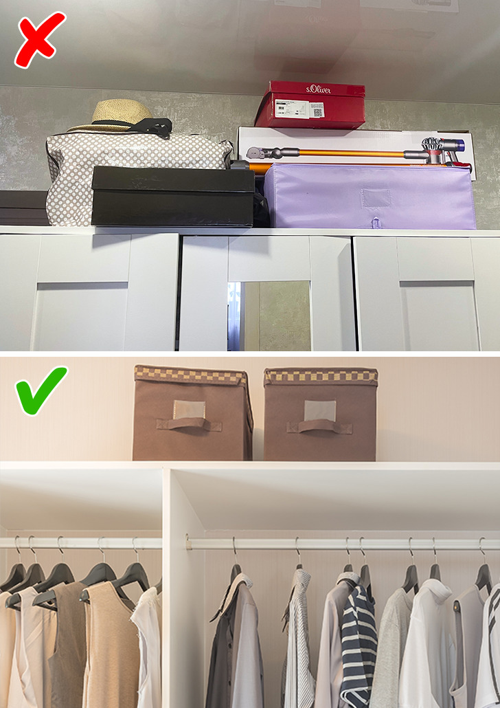 Не е неопходно веднаш да ги фрлате работите или да ги скриете на балконот. Можете да земете стилски корпи или кутии и да ги ставите на кабинети. Тоа може да биде слама, пластика, ткаенина, па дури и само картонски кутии, насликани со боја или тапети.