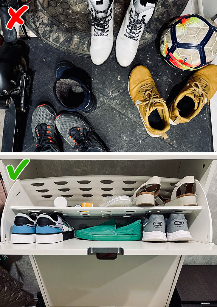 Нередот во близина на влезната врата не само што му дава пнепријатен изглед на ходникот, туку и го отежнува движењето и собирањето. Покрај тоа, хаотичната акумулација на чевли е едноставно нехигиенска.
