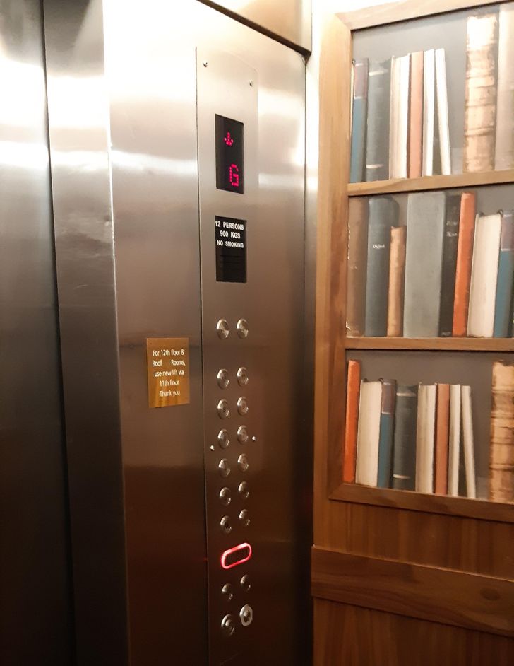 „Хотелот го украси лифтот со тапет што изгледа како полица за книги.“