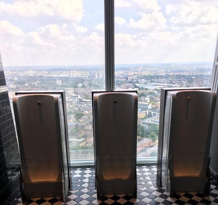 „Писоари во облакодерот Шард покрај панорамски прозорци“
