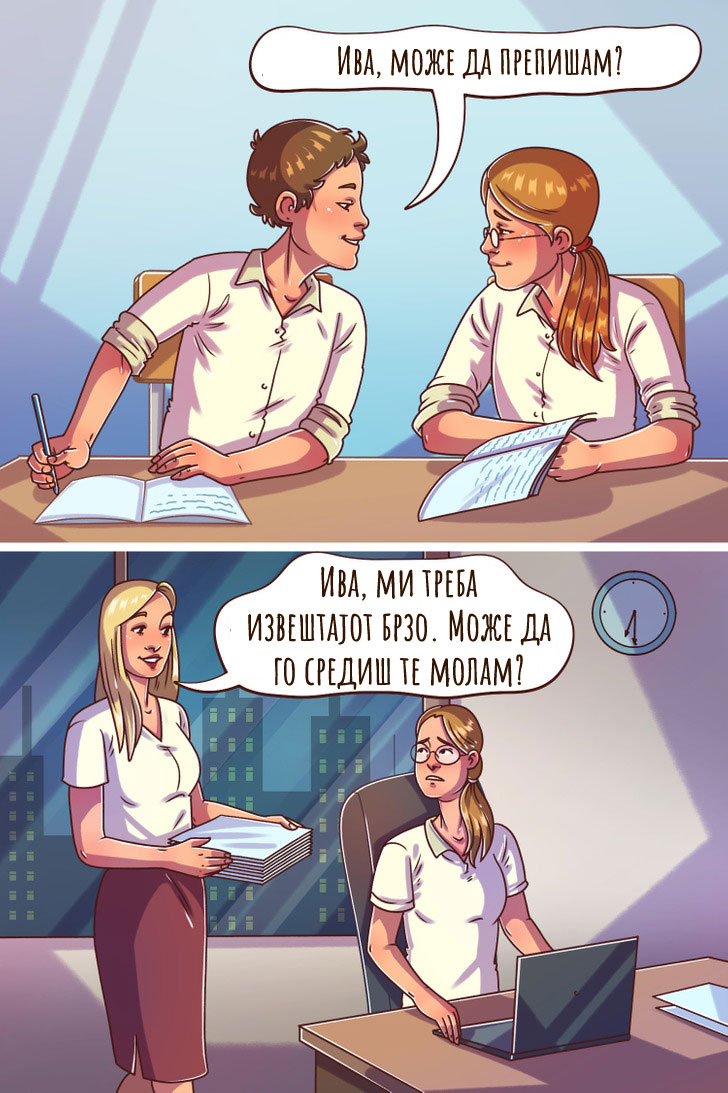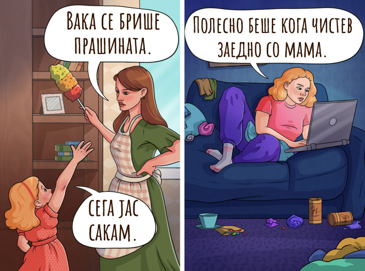Во детството, нашата мајка се обидуваше да не вклучи во процесот на чистење бидејќи беше полесно и побрзо да ги правиме работите заедно. Денеска со тага се потсетуваме на тие времиња.