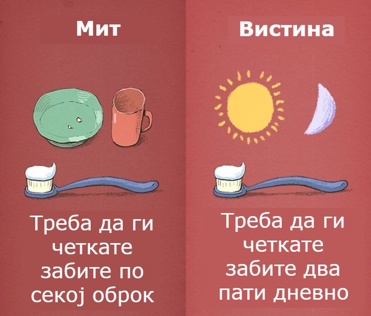 5. Мошне често го слушаме советот дека треба да ги миете забите после секој оброк. Но, всушност, не треба да ги миете забите честопати под никакви околности. Ова е особено точно ако неодамна сте јаделе нешто слатко или кисело. Слојот на вашите заби, омекнат од киселините, сега ќе биде поранлив на штета од абразивните компоненти на пастата за заби.