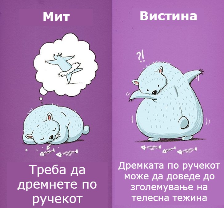 6. Можеби се чини дека нема ништо послатко од брзото дремнување после оброк. Сепак, таквата навика може да има негативни последици, особено ако имате за цел да внимавате вашата фигура. Кога некое лице спие, неговото тело почнува да ги третира калориите како „резерва“ наместо да ги согорува. На овој начин, спиењето после тежок оброк може да доведе до дополнително зголемување на телесната тежина.