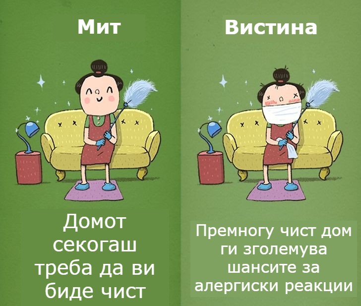 7. На нашите имунолошки системи им треба „обука“. Кога надворешни бактерии влегуваат во нашиот систем, антителата почнуваат да се развиваат за да помогнат во уништување на инфекцијата. Ако некое лице живее во санитарни услови, овие антитела немаат против што да се борат. Во исто време, хемикалиите што се користат за создавање на ултра-чиста околина може да му наштетат на телото. Некои освежувачи на воздухот, на пример, може да доведат до хроничен бронхитис.