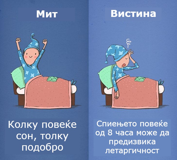 9. Многу луѓе мислат дека колку повеќе спиеме, толку повеќе нашето тело е во состојба да се одмори. Но, всушност, прекумерното спиење може да биде исто штетно како и недоволно спиење. Еден професор од Центарот за истражување на спиењето верува дека повеќе од осум часа сон може да доведе до неуспеси во работата на мозокот, како резултат на што поединецот може да се чувствува слаб и ќе размислува побавно.