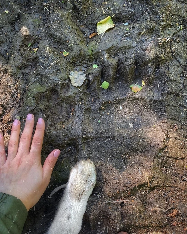 Отпечаток од кафеава мечка наспроти рака на возрасен човек и шепа на куче