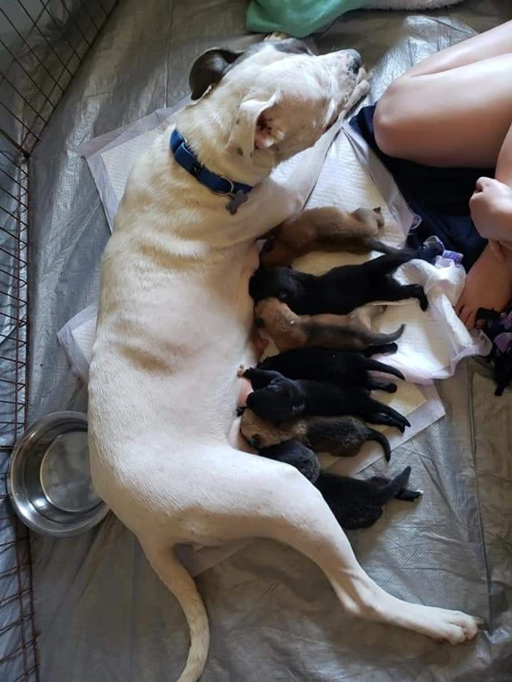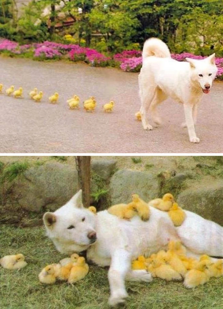 „Ова куче неодамна ги загуби своите бебиња. Таа беше поврзана со некои кученца што останаа без мајка и таа веднаш и со задоволство ги прифати како свои“.