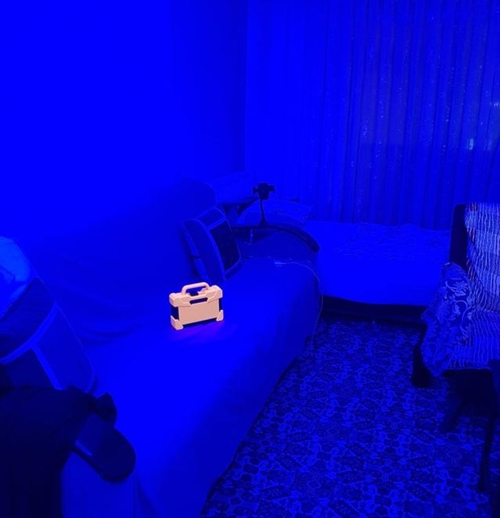 7. „Мојата портокалова кутија со алатки изгледа како предмет за земање во видео игра, под синото светло на мојата соба“.