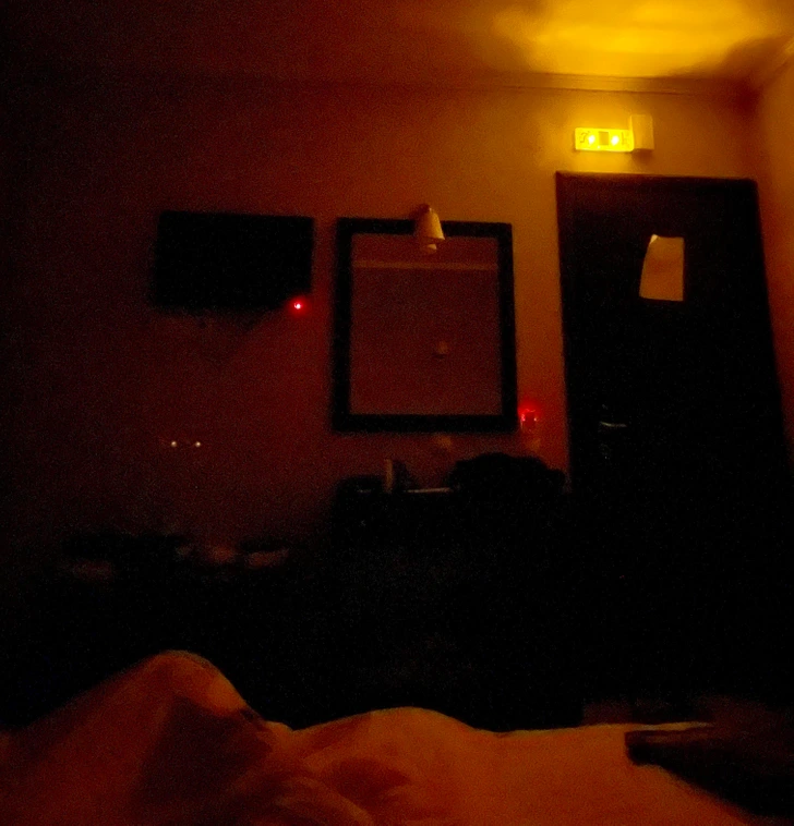 13. „Ова светло за излез за итни случаи во мојата еднокреветна хотелска соба со една врата“.