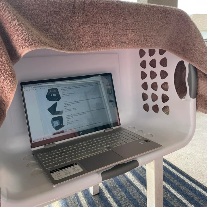 14. Користам корпа за перење и крпа за да го затемнам мониторот на лаптопот кога е премногу сончево во просторијата“.