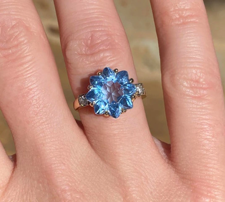 „Ова беше прстенот на мојата прабаба што ми го даде мене. Тоа е син топаз и дијамант. Дали некој некогаш видел вака исечен скапоцен камен?“
