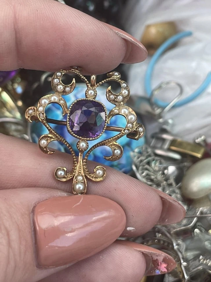 „Купив тегла со скршени парчиња накит за 30 долари. Мислев дека е главно глупости додека не наидов на овој викторијански златен брош од 15 карати”.