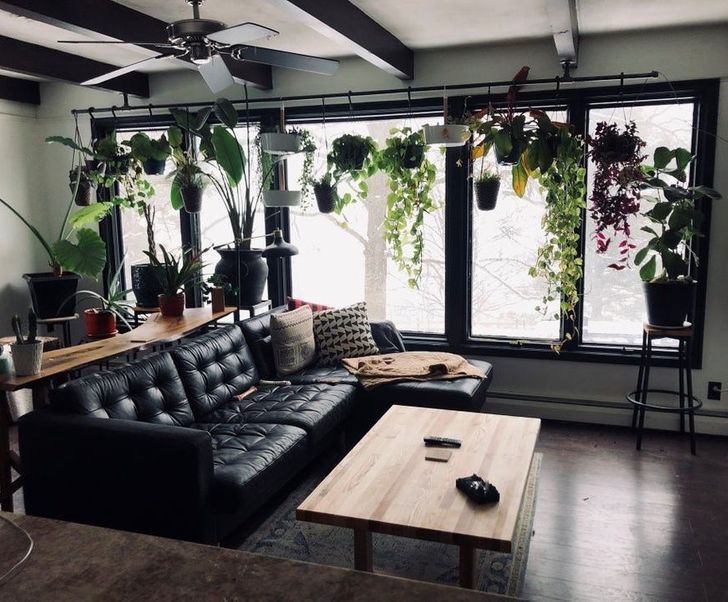 5. „Сам ја направив масичката, масата за зад каучот и сам ја монтирав шипката за растенија од челична цевка. Исто така, морав да ја бојадисам рамката на прозорецот во црно за подраматичен изглед.“