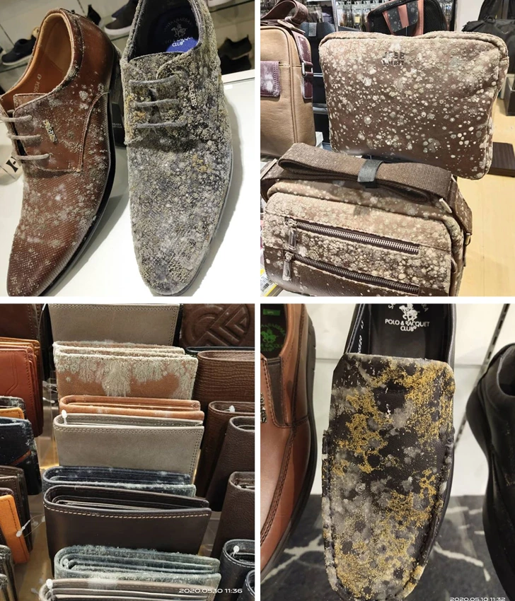 Ова се случи со кожните производи во продавница која беше затворена 53 дена (тоа се случи во Малезија каде влажноста е многу висока).