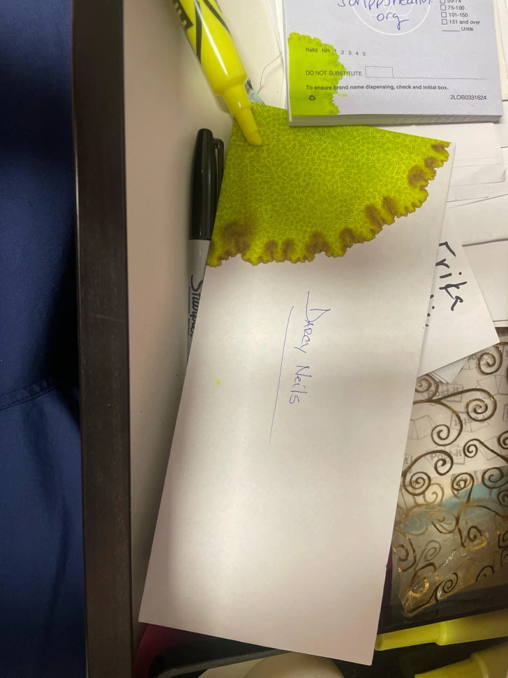Еве како маркерот без капаче во фиоката ќе истече на пликот во текот на неколку недели.