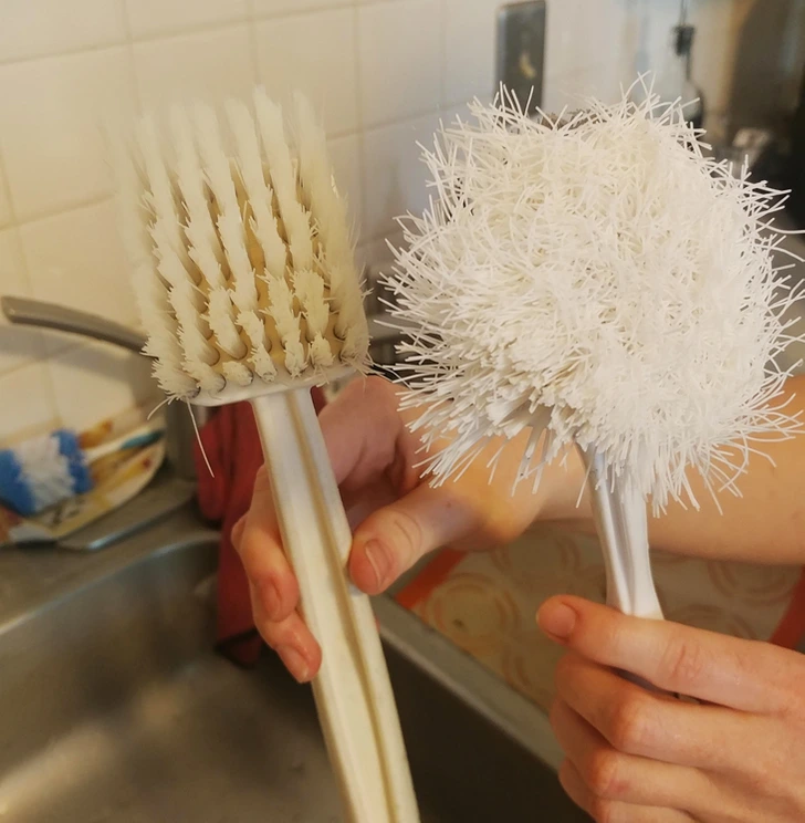 Еве што се случи по 2 години користење евтина четка за садови (десно). Лево — е висококвалитетна четка за садови што се користи 15 години.